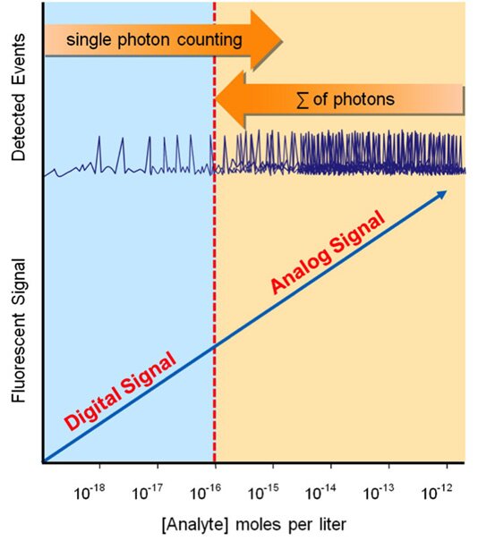 The Erenna Immunoassay System incorporates a robust digital molecule-counting module to count photons. A large dynamic range of 4+ logs is obtained by combining single-molecule counting (low range) with photon counting (mid range) and total light measurements (high range).